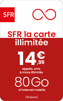 – Offre soumise à conditions, valable exclusivement pour une durée de 30 jours après activation. Réservée aux clients possédant déjà une carte SIM SFR La Carte. Usage personnel seulement. Plus d’informations disponibles dans nos points de vente ou sur sfr.fr.
